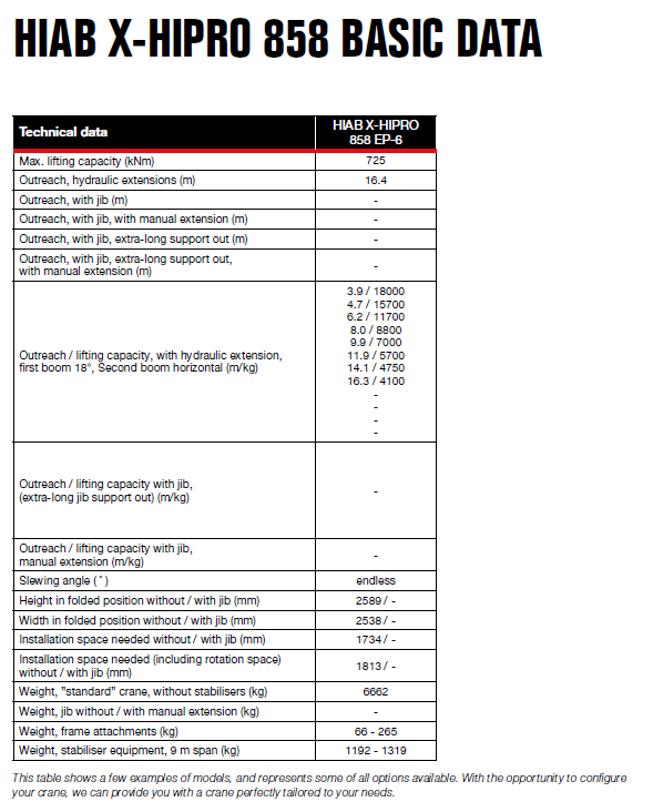 The integrated HIAB X-HIPRO 858 EP-6 crane offers exceptional lifting capabilities: